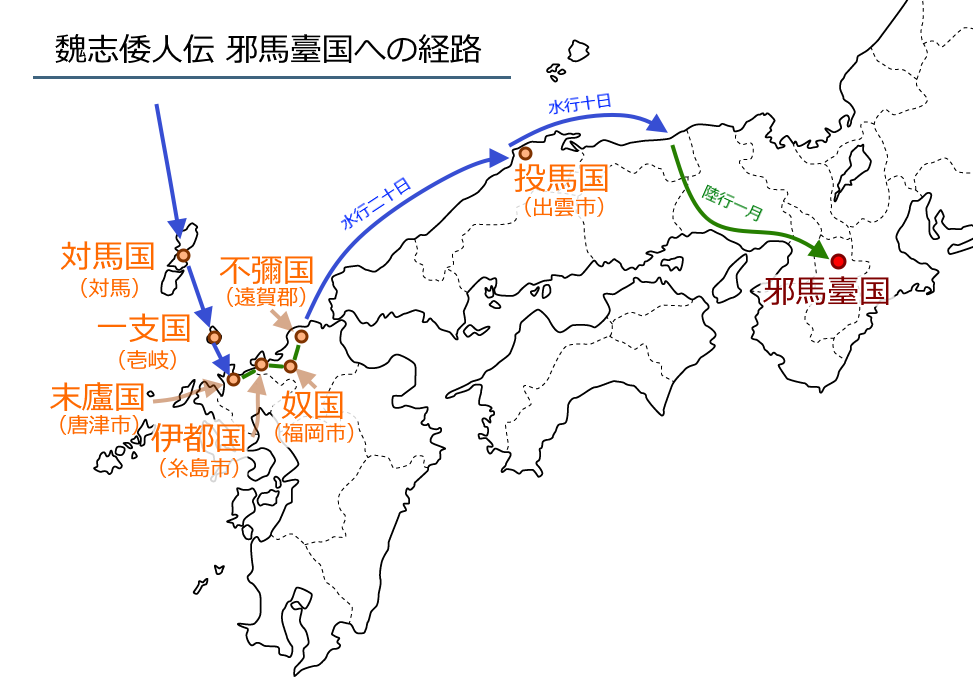 | 対馬国 | 南へ海を渡ること千余里(400km位)。実際は50km程。 | 一支国 (壱岐) |
